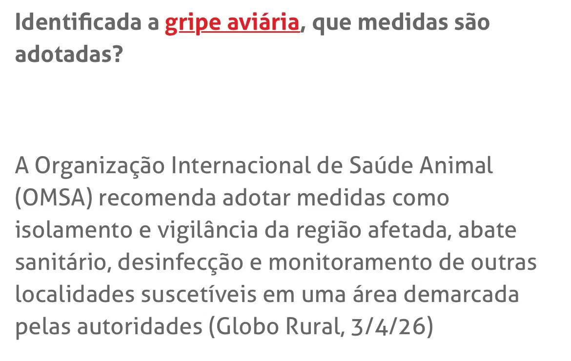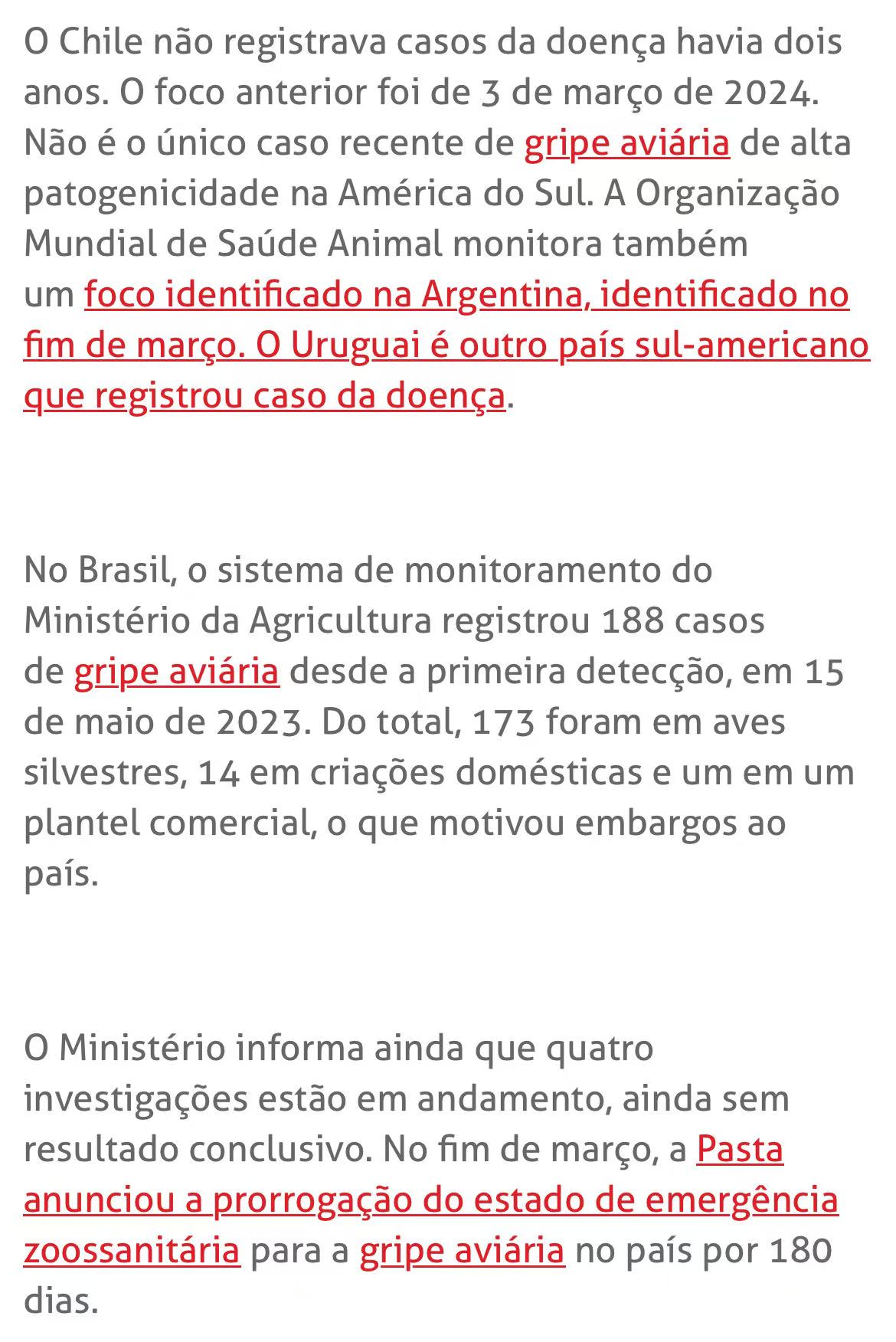 与此同时,巴西自2023年5月首次检测到禽流感以来,已累计记录188例病例(野生鸟类173例、散养家禽14例、商业养殖场1例)。目前仍有4起疑似疫情正在调查中。3月底,巴西政府宣布将动物卫生紧急状态再延长180天。
