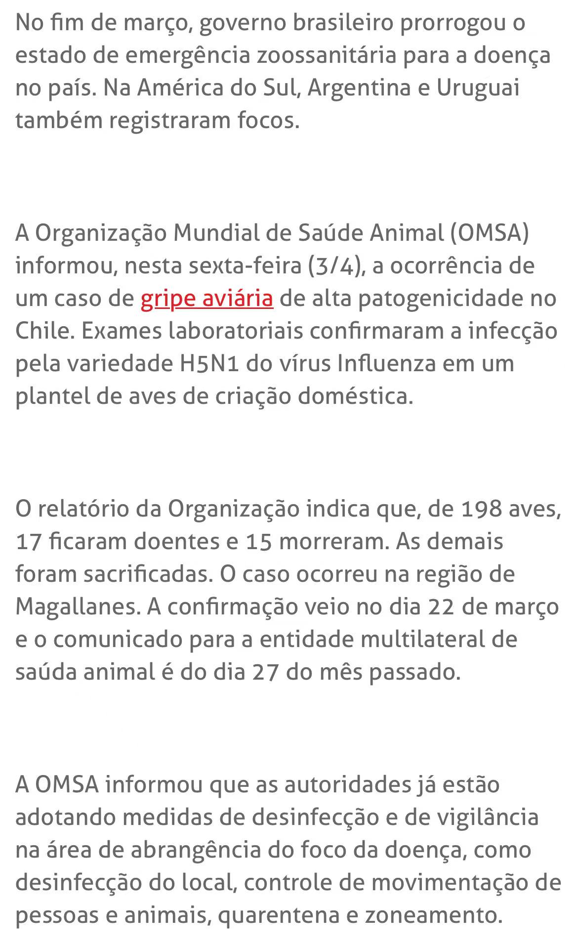 4月3日,世界动物卫生组织通报,智利麦哲伦大区一群家养禽类确诊H5N1高致病性禽流感,在198只禽鸟中,17只发病、15只死亡,其余被扑杀。这是智利自2024年3月以来首次报告禽流感病例。