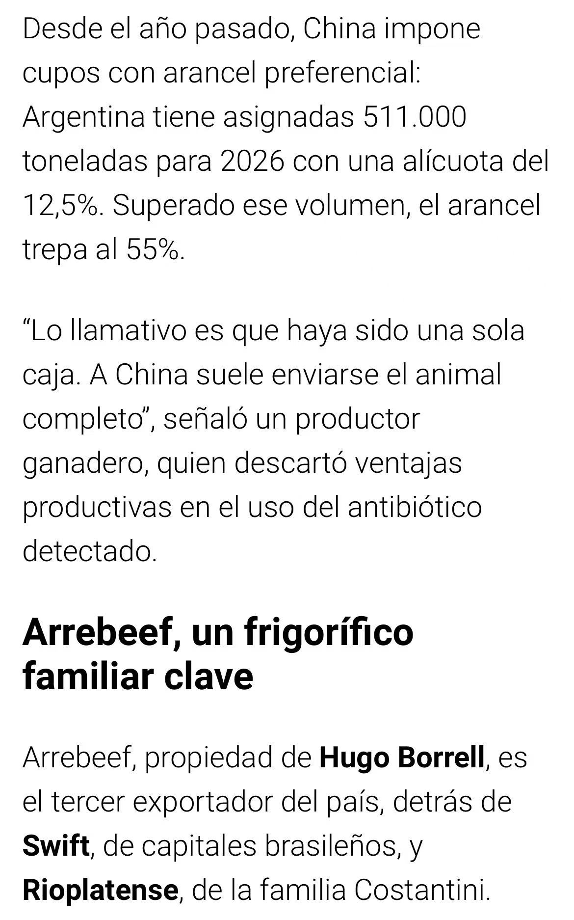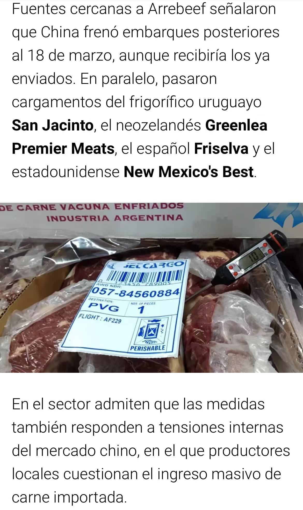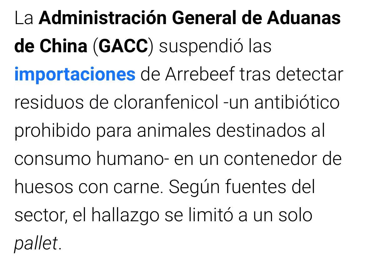 3月19日,中国海关总署通报,在阿根廷Arrebeef(2082厂)输华牛肉中检出禁用抗生素氯霉素,随即暂停该厂对华出口资质。涉事货物仅为一个22吨的集装箱。