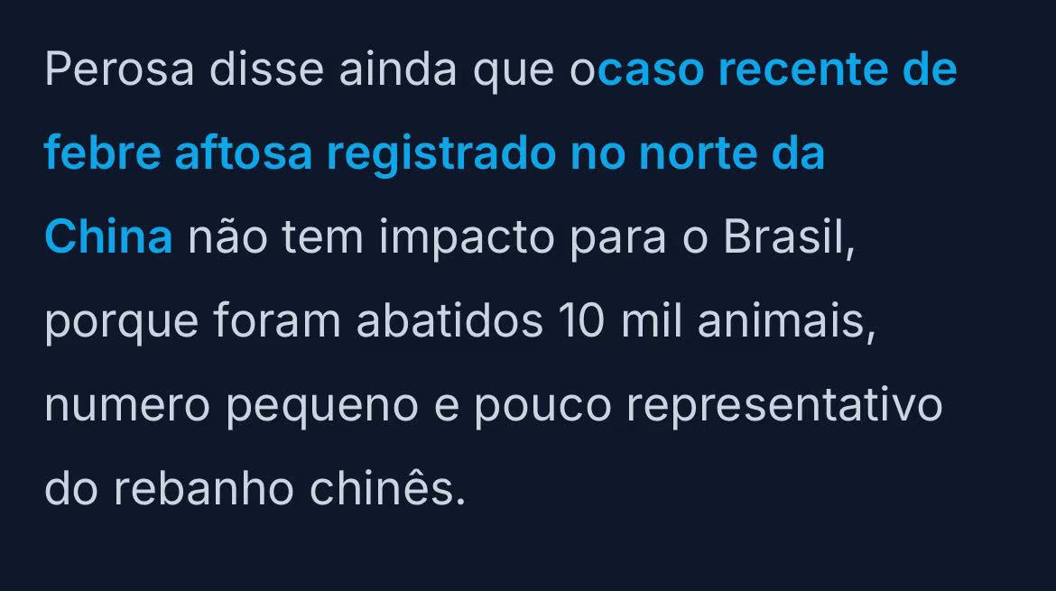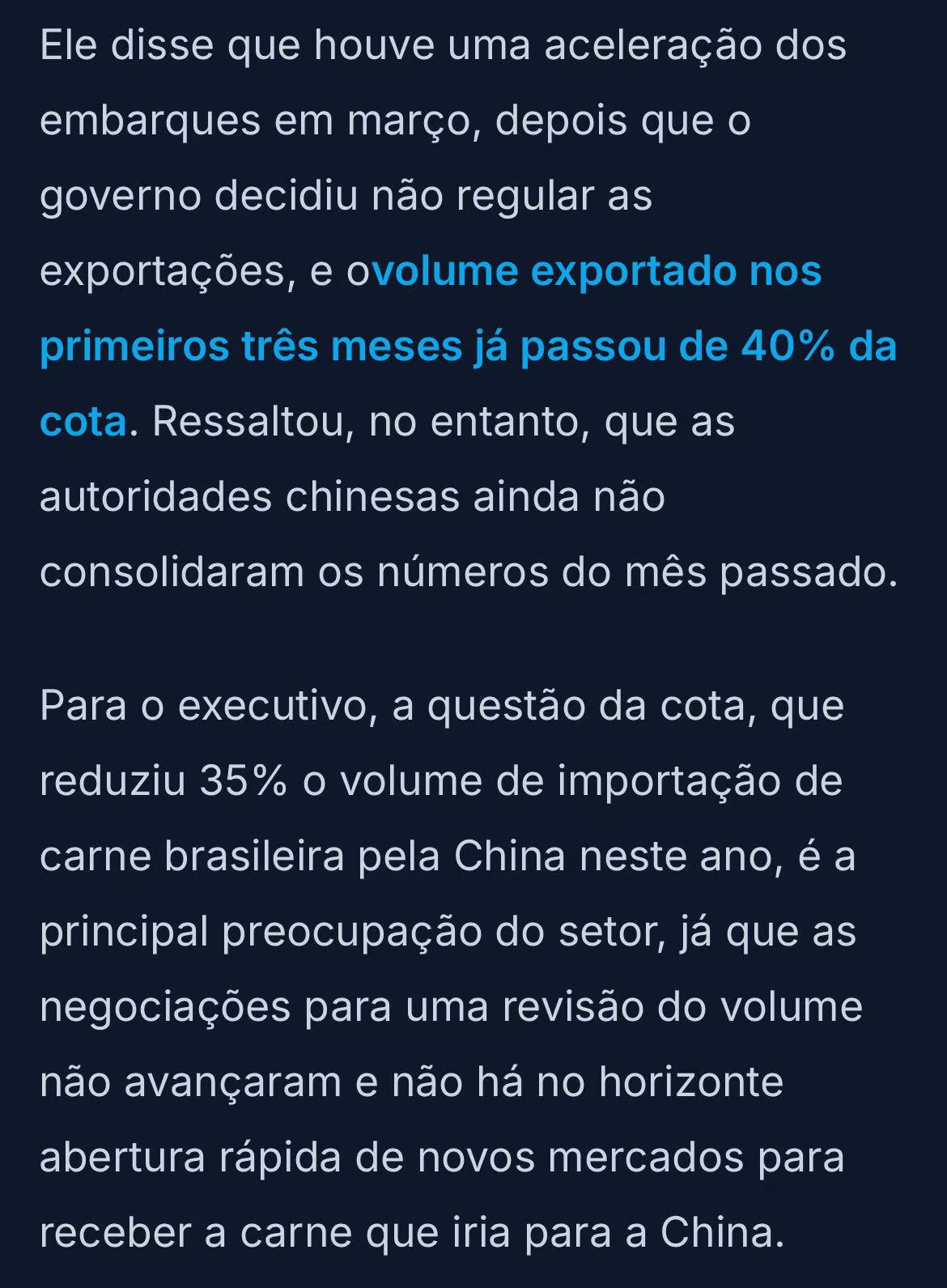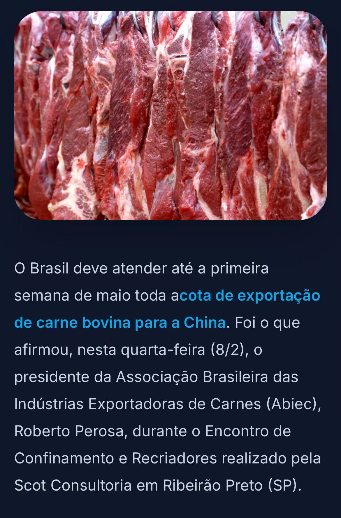 巴西肉类出口工业协会(Abiec)主席罗伯托·佩罗萨4月8日警告:巴西对华牛肉出口配额预计将在5月第一周全部耗尽。