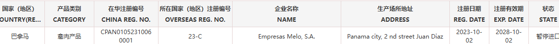 暂停受理巴拿马1家禽肉企业(注册编码为:23-C)自2026年4月14日(含)起启运的输华产品进口申报。