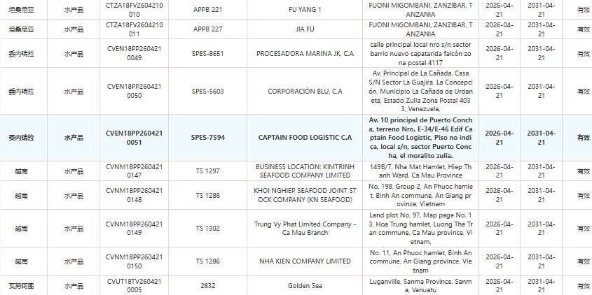 33.海关总署新增委内瑞拉3家水产品企业输华注册(注册编码为:SPES-8651、SPES-5603、SPES-7594)自2026年4月21日(含)后生产的输华产品进口准入。