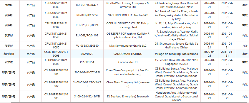 28.海关总署新增塞内加尔1家水产品企业输华注册(注册编码为:002/03/C)自2026年4月21日(含)后生产的输华产品进口准入。