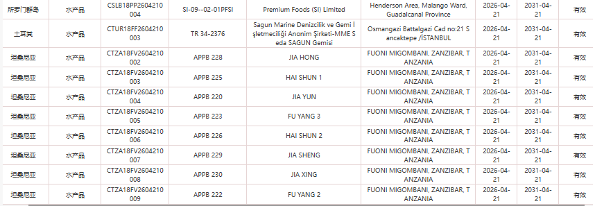 30.海关总署新增所罗门群岛4家水产品企业输华注册(注册编码为:SI-09-03-01CZC-BSI、SI-09-02-03 CZC-SWSI、SI-09-02-04DJ-SWSI 、SI-09--02-01PFSI)自2026年4月21日(含)后生产的输华产品进口准入。