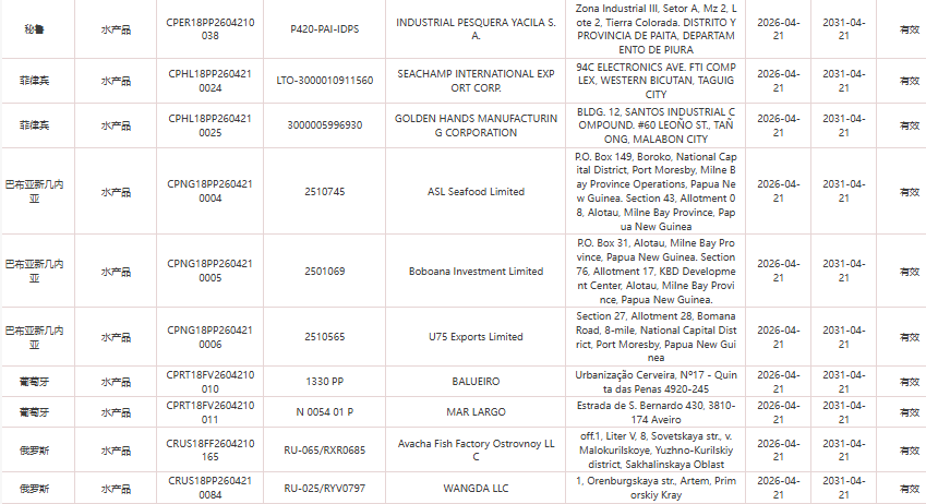 23.海关总署新增秘鲁1家水产品企业输华注册(注册编码为:P420-PAI-IDPS)自2026年4月21日(含)后生产的输华产品进口准入。