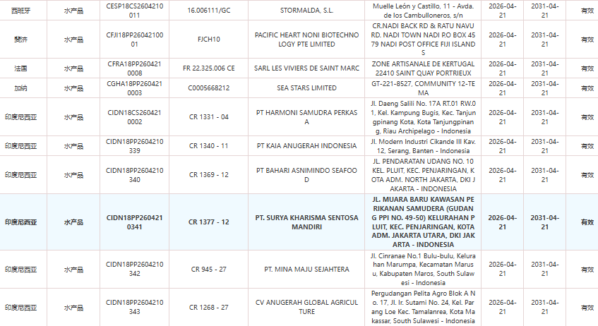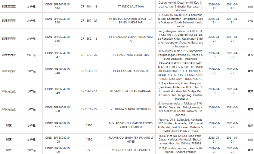 10.海关总署新增印度尼西亚13家水产品企业输华注册(注册编码为:CR 1331 - 04、CR 1340 - 11、CR 1369 - 12、CR 1377 - 12、CR 945 - 27、CR 1268 - 27、CR 1184 - 16、CR 1357 - 27、CR 1352 - 16、CR 1372 - 27、CR 1338 - 16、CR 1360 - 11、CR 1076 - 27)自2026年4月21日(含)后生产的输华产品进口准入。