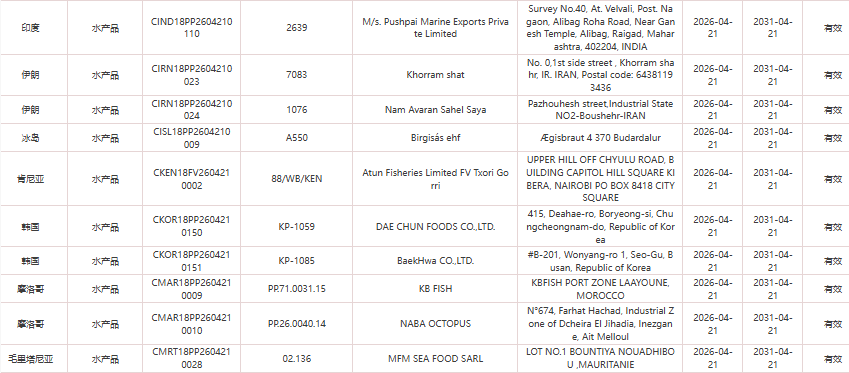 11.海关总署新增印度4家水产品企业输华注册(注册编码为:1990、1390、853、2639)自2026年4月21日(含)后生产的输华产品进口准入。
