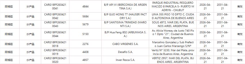 1.海关总署新增阿根廷9家水产品企业输华注册(注册编码为:4844、5684、5679、5150、2276、4408、4857、4783、2266)自2026年4月21日(含)后生产的输华产品进口准入。