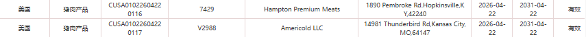 1.新增美国5家猪肉企业(注册编码为:7429、V2988、V1342、V1648、21069W)自2026年4月22日(含)后生产的输华产品进口准入。