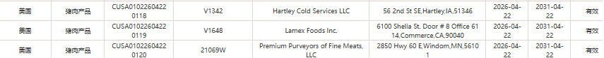 2.新增美国4家禽肉企业(注册编码为:V47903、V1342、V2988、V1648)自2026年4月22日(含)后生产的输华产品进口准入。
