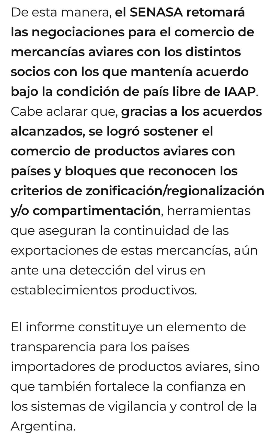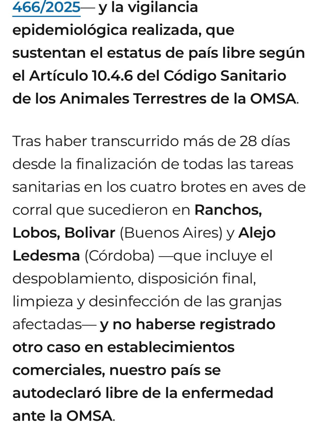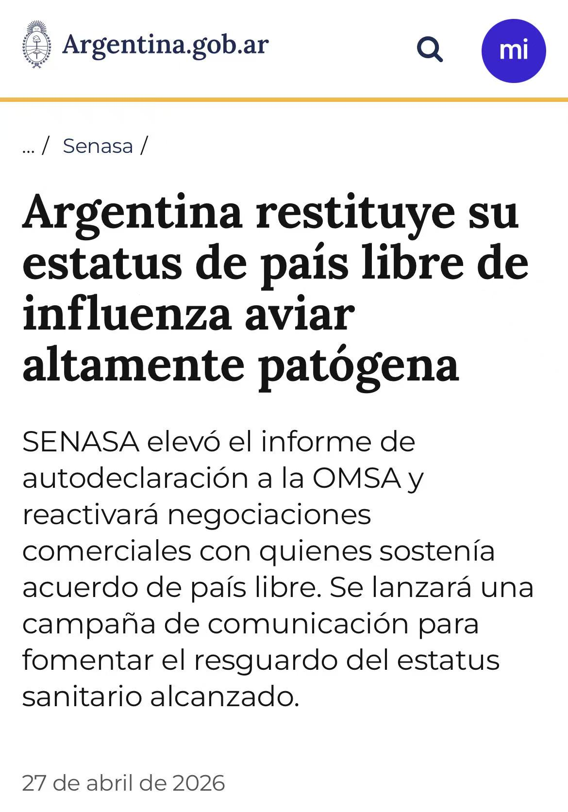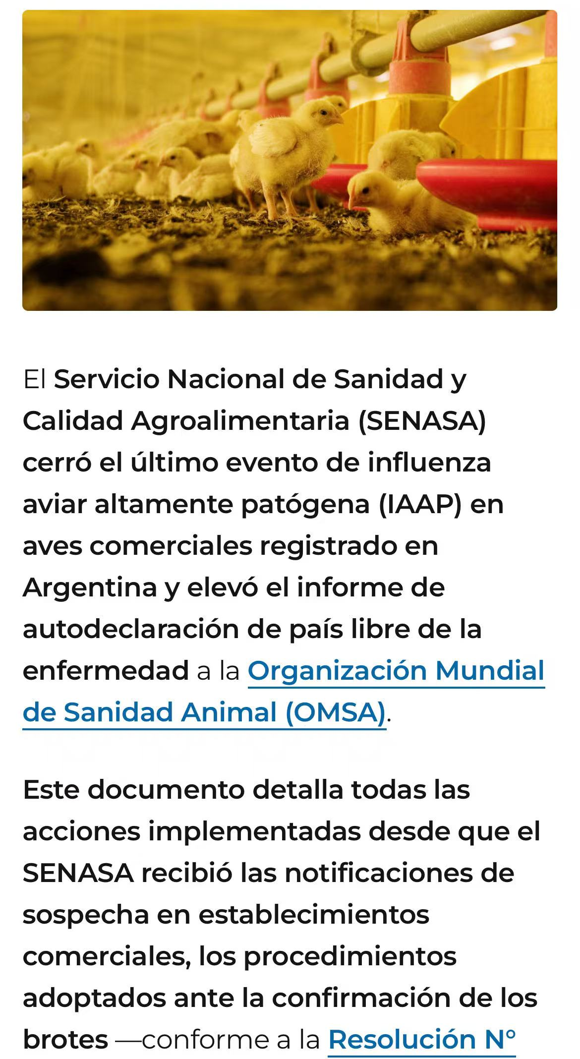 4月下旬,阿根廷国家农业食品质量与卫生局(SENASA)正式向世界动物卫生组织(OMSA)提交自我声明报告,宣布恢复“高致病性禽流感无疫国家”资格。在完成布宜诺斯艾利斯省和科尔多瓦省最后4起商业养殖场疫情的扑杀、消毒等处置工作后,阿根廷已连续28天未出现新病例。