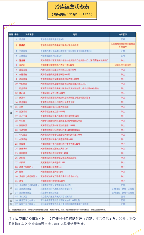 捷嘉 · 战“疫” | 冷库运营状态表(最后更新:11月09日17:01)