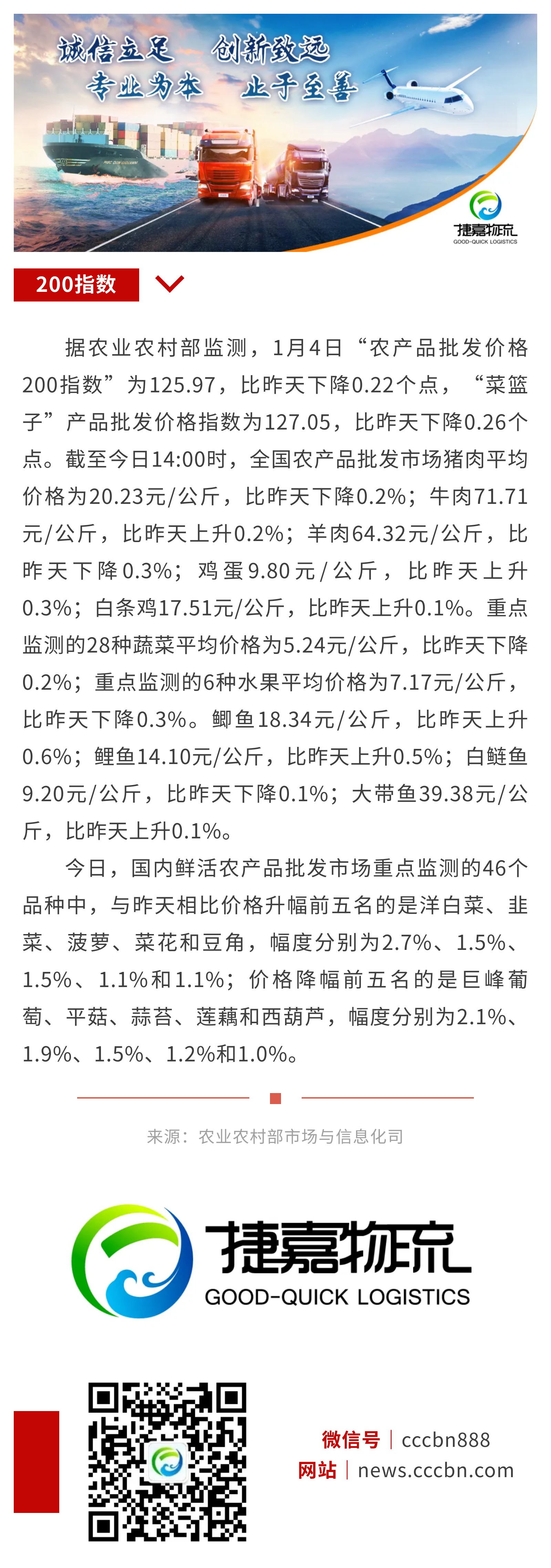 1月4日:“农产品批发价格200指数”比昨天下降0.22个点